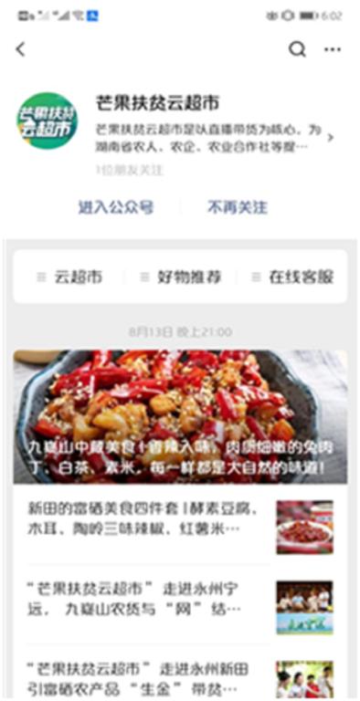 运用互联网思维帮助扶贫脱困,除了媒体直播,还有另一种方式——搭建微信公众号电商平台。成员们通过调查,选出两个具有代表性的电商平台:湖南电商扶贫小店微信公众号和芒果扶贫云超市微信公众号。