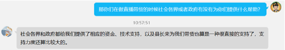 成员针对网络直播带货扶贫问题向相关工作人员进行了采访,工作人员指出,在直播带货的过程中,团队得到了政府及社会各界资金、技术的支持,县长直播带货的方式也带来了较高的销量;同时,受访工作人员指出,网络直播带货扶贫方式的成功,主要倚重的是产品的质量和以地方特色为卖点的模式,从而吸引更多受众。