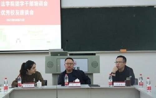 法学专业本科2005届校友文靖,党务与学生工作办公室主任、研究生辅导员刘岳峰老师,团委书记、2020级本科生辅导员美丽努尔老师,团委、学生会、研究生会部分骨干同学参与座谈。