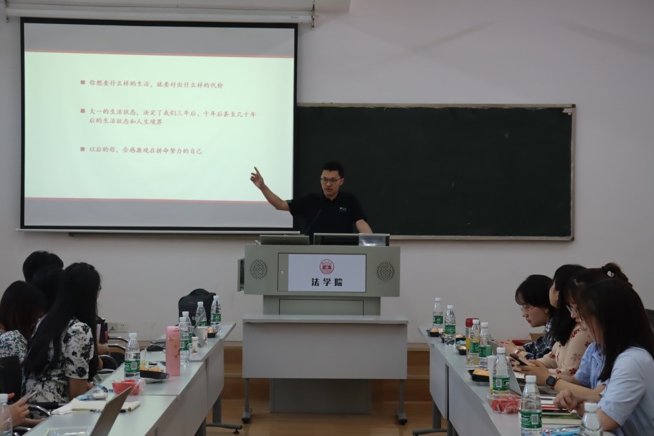 2014级优秀校友卢佳拓以及优秀毕业生唐智灵、简洁、李珑、黄雪和姚远作客。活动由2018级法律硕士曹淑静主持,主要分为两部分,首先由卢佳拓学长讲述他考取选调生后的基层生活,其次是优秀毕业生的就业经验分享会。