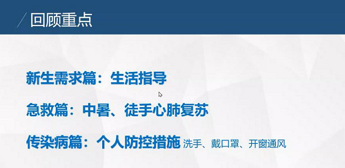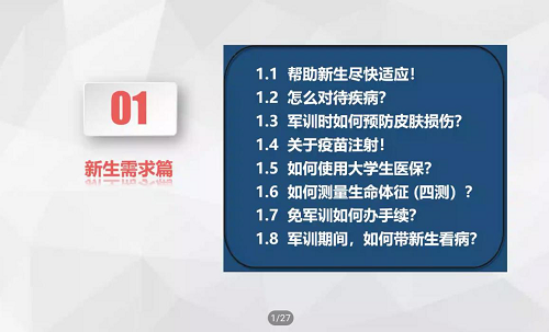 在新生需求部分,朱艳玲老师系统性地讲述了帮助新生尽快适应、对待疾病的方法、预防皮肤损伤的方法、关于疫苗注射问题、适用大学生医保的方法、测量生命体征的方法、办理免军训手续的方法以及军训期间带新生看病的方法等七方面的内容。以上七方面的内容覆盖面广,基本上解决了新生的常见问题。内容科学准确,解决新生助理的许多疑问。