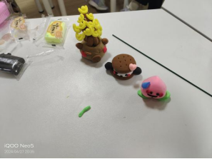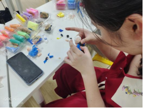 接近晚上20点整,活动进入了第二个环节:同学们纷纷选择自己擅长的或者喜爱的材料开始进行手工diy活动。大家大展身手,个个化身“大国工匠”,对自己手中的作品精益求精,力求让它呈现出脑海中的那副画面。制作现场热火朝天,毕竟,有什么能比亲手做出一点喜爱的物品更有成就感呢?面对着同学们手中的一个个色彩缤纷的花环,又有谁能想到它们原先只是一束笔直的扭扭棒呢?除去扭扭棒,选择了黏土和陶土的同学也做出了不少颇具创意的作品,譬如:能萌化人心的小怪兽、金光闪闪的摇钱树等。