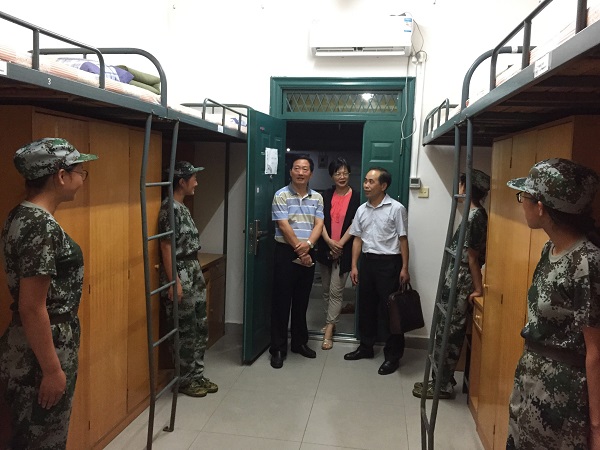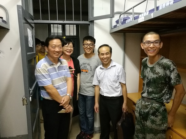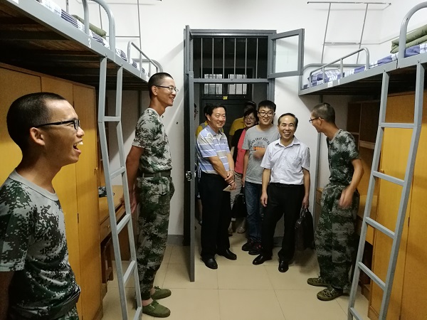 “老师好,提前祝各位老师教师节快乐”,在三区十三栋男生寝室,各位同学向前来慰问的老师们致以教师节的问候。“军训结束后大家就要步入正常的大学生活了,给自己一个目标,给自己的大学四年一个规划,清楚自己在大学想要学什么,未来要做什么很重要。希望同学们开学后能够通过学院开设的专业导论课和生涯发展规划课来加强对专业的认识,明确自己未来的发展道路”,李书记叮嘱同学们大学要有目标的学,不能虚度大学时光。