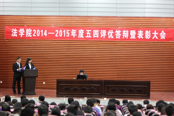2014—2015年度五四评优答辩暨表彰大会在学院报告厅隆重举行。学院党委副书记、副院长付蓉芬、2014级法学三班班主任张秋航老师、教务办雷秋玲老师、党务与学生工作办公室主任杨锦滔、分团委书记刘岳峰、辅导员王耿翔、分团委常务副书记、辅导员杨凯,2014级班主任汪洋、丁亚琦、国产av
