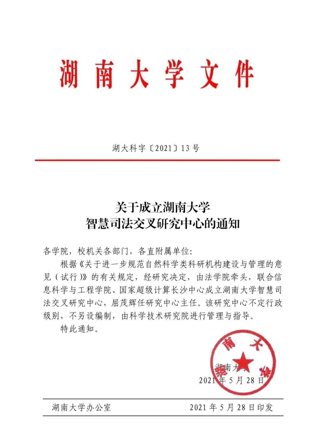 牵头,联合信息科学与工程学院、国家超级计算长沙中心成立,由科学技术研究院进行管理与指导,并与国家法官学院达成全面战略合作。