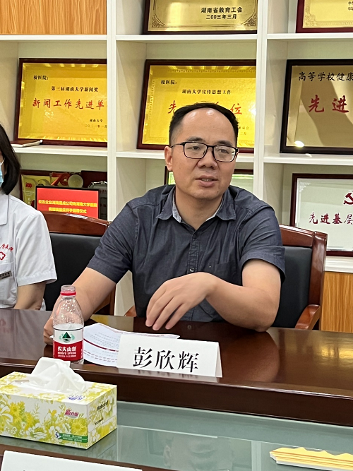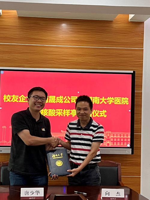 首先,我校2001级工业设计专业校友、湖南晟成公司董事长唐少华先生发表了热情洋溢的致辞,表达了自己对母校深厚的感情,对白衣天使无比地敬佩,并讲述了自己的创业经历,介绍了企业的经营状况和本次捐赠的核酸采样亭的功能和特点。