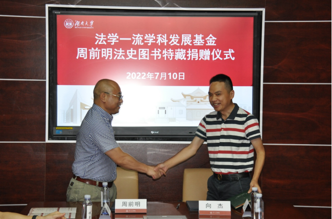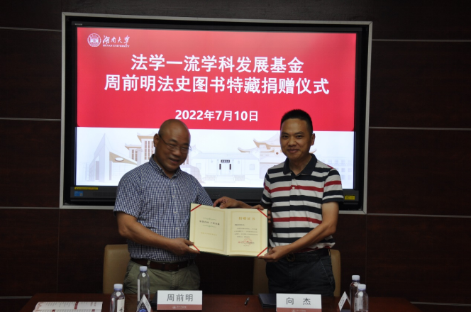 盛夏的岳麓山下生机勃勃,阳光明媚。7月10日下午,法学楼内高朋满座,到处是欢声笑语,法学一流学科发展基金-周前明法史图书特藏项目捐赠仪式在405会议室隆重举行,价值38万元的《中国法制史丛刊》系列图书(420册)正式入藏国产av