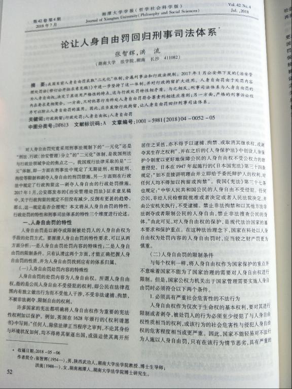 洪流同学系我院2015级博士研究生,专业方向为刑事法学,已发表CSSCI期刊论文多篇。其中在《湘潭大学学报》与导师张智辉教授合作发表论文《论让人身自由罚回归刑事司法体系》