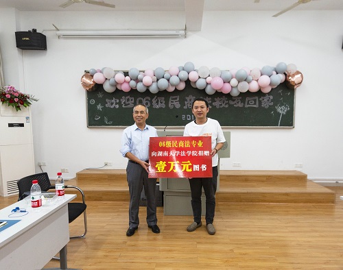 分享完毕后,大家起身向老师鞠躬致敬,感谢老师培育之恩。为表达校友对母校的赤子之情,06级民商法校友们集体为母校捐赠一万元图书,为母校法学教育发展贡献力量,屈茂辉院长代表国产av