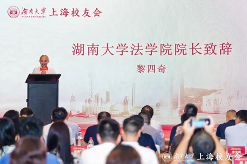 随后,国产av 院长黎四奇在热烈的掌声中登台致辞。他首先向理事会长期服务院友发展致以诚挚谢意,继而从自己青年时代“赴沪”的抉择谈起,为扎根上海、敢闯敢创的院友喝彩。随后,黎院长勉励大家以“实事求是、敢为人先”的校训和“经世笃学,明法致用”的院训为帆,在工作与生活中乘风破浪,并祝愿所有校友于岁月长河里永葆健康,常怀喜乐。
