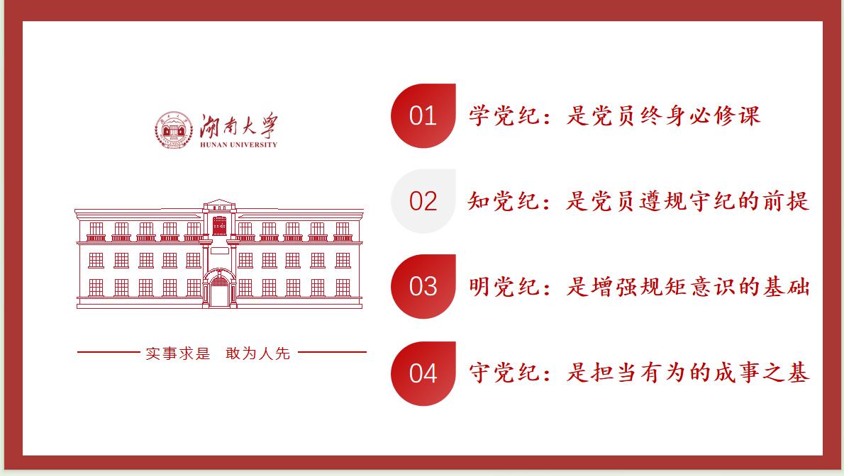本次党课分为四个专题,从学、知、明、守四个部分展开。党课中强调,学党纪是党员的终身必修课,党员同志要以身作则、率先垂范地学好党章党纪,在学党纪中明方向、强筋骨、修初心;知党纪是党员遵规守纪的前提,党员同志要保持敬畏心、守牢底线、做到自律,将党纪内化于心、外化于行;明党纪是增强规矩意识的基础,党员同志要明规矩、知敬畏、守规矩,要深刻认识到纪律的重要性,明白违反纪律的严重后果,增强遵守纪律的自觉性和坚定性;守党纪是担当有为的成事之基。