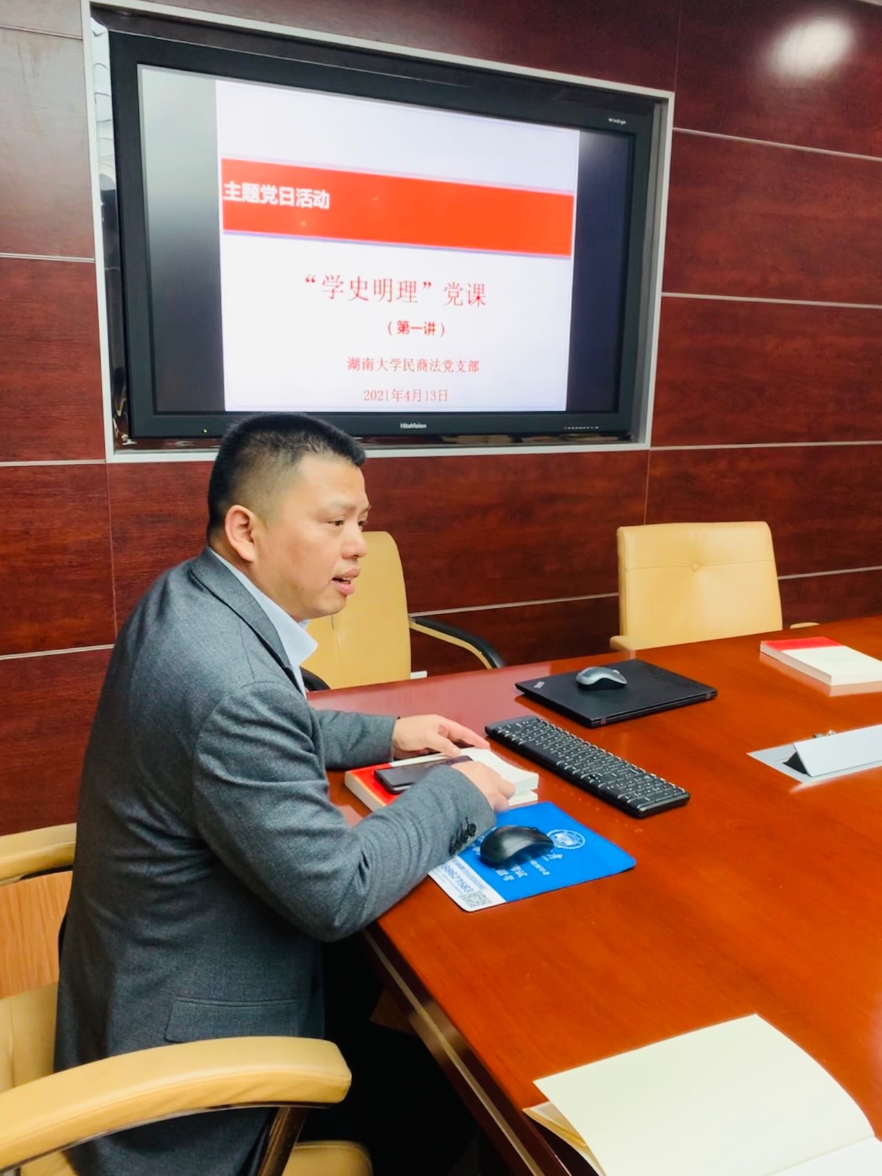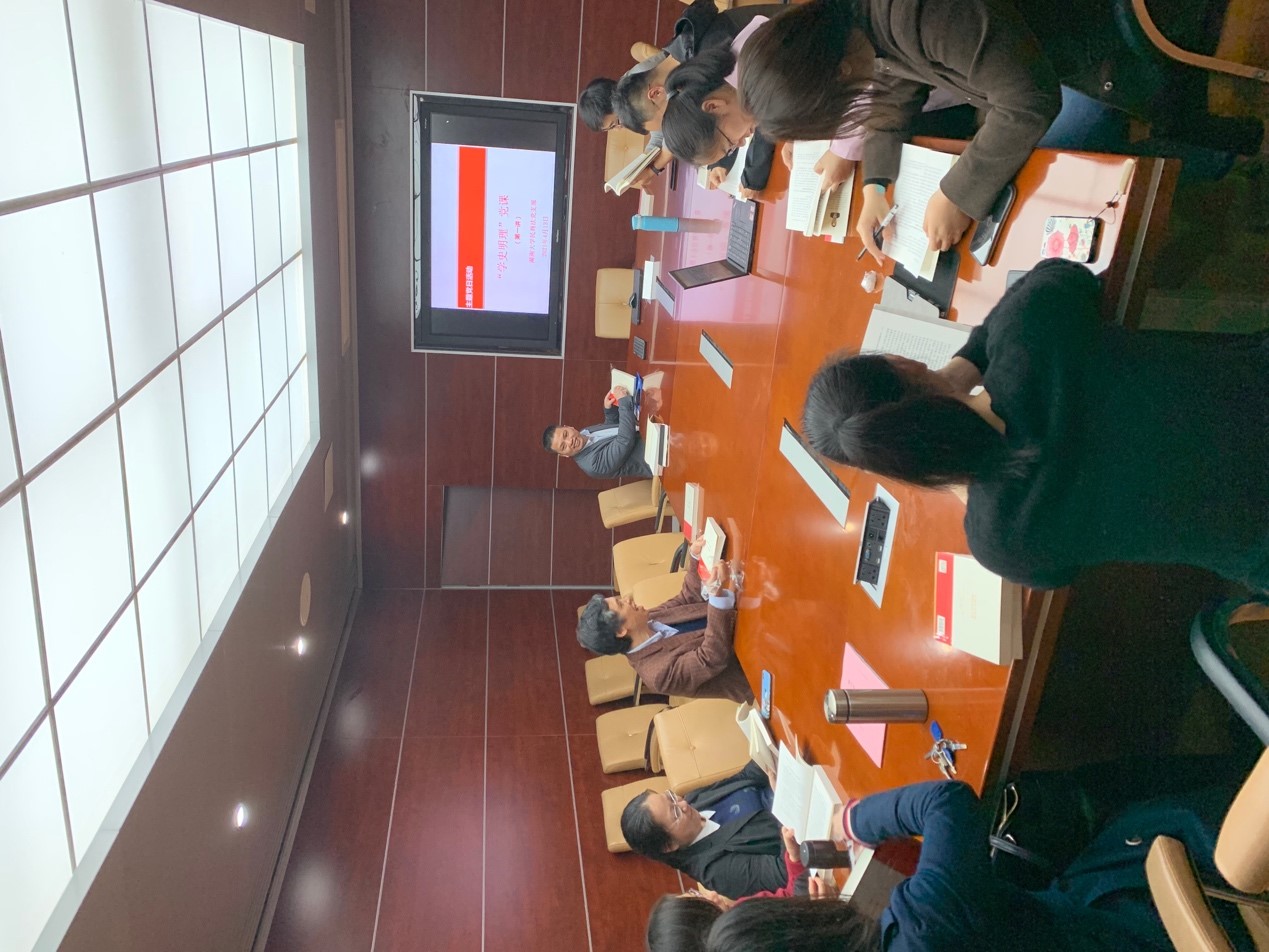 民商法党支部集聚法学楼405,党支部书记张红同志宣讲“学史明理”党课第一课,支部成员认真学习领会党课精神。