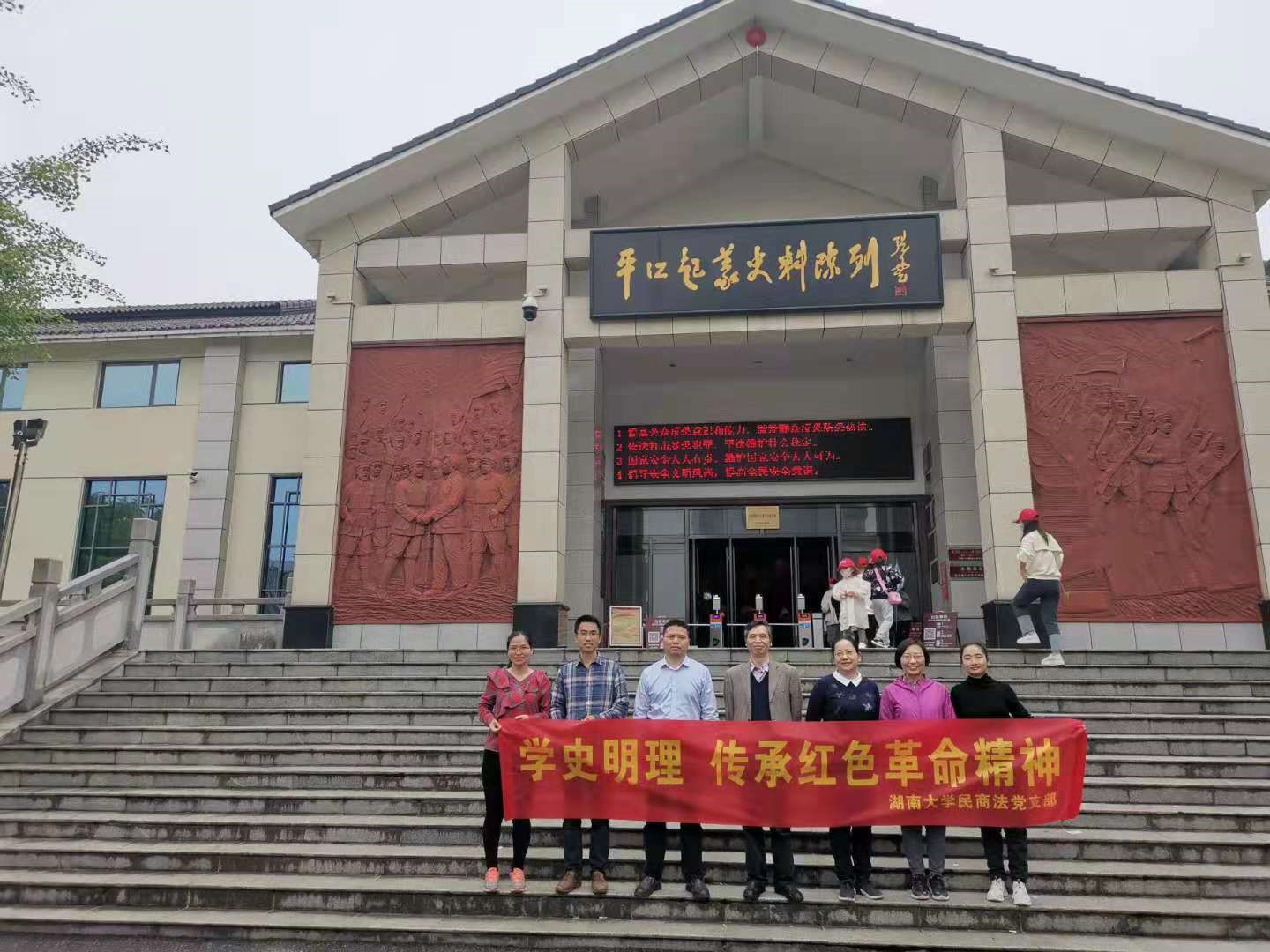 民商法党支部一行8人,为了传承红色基因、庚续红色血脉,在支部书记张红的带领下,前往平江起义纪念馆、平江起义旧址、长寿镇仙姑岩藏军洞、红军营等地参观,进行“学史明理”的红色革命精神的学习活动。