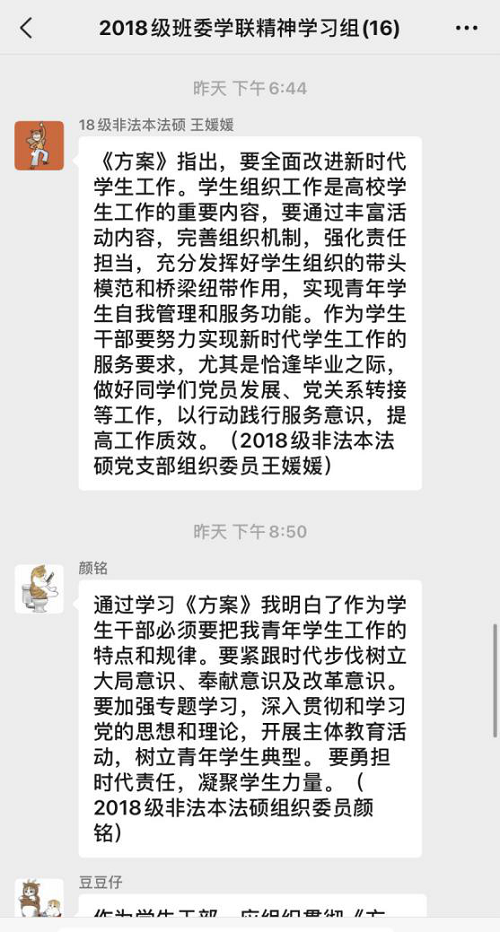 今日,我院20级硕士研究生班委在院研究生会的组织下针对中央办公厅关于学生工作的最新文件进行了集中学习。针对文件信息和传达的精神,我们就学生干部的自身素质提高和自律性加强进行了着重讨论,对学生干部如何“去官僚化”,“去行政化”,并就如何与同学们进一步加强联系和更好地开展工作等达成了一致意见。另外,在如何进一步丰富学生活动,加强对外交流等方面也一一进行了讨论,会上,各班级干部踊跃发言,在其中,本人也学习到了许多管理班级的经验,收获颇丰。