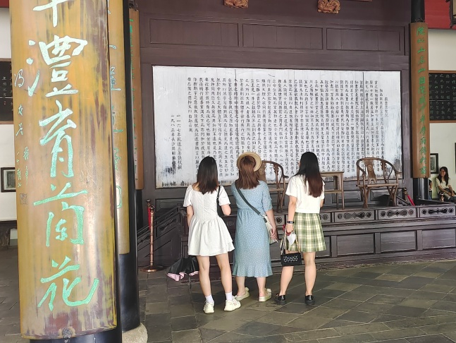 岳麓书院素来享有“中国四大书院之一”的美誉。大家步入岳麓书院正门,首先映入眼帘的是“惟楚有材,于斯为盛”的对联。同学们在此处合影留念。走入书院,同学们各自散开,浏览石柱上的对联,阅读《岳麓书院记》,感受岳麓书生爱国务实的底色,体悟书院传道济民、经世致用、实事求是的精神内涵。