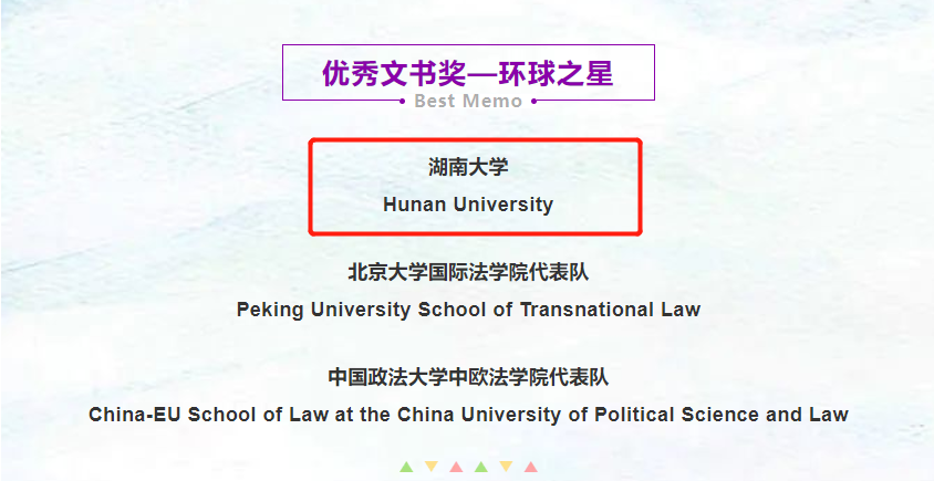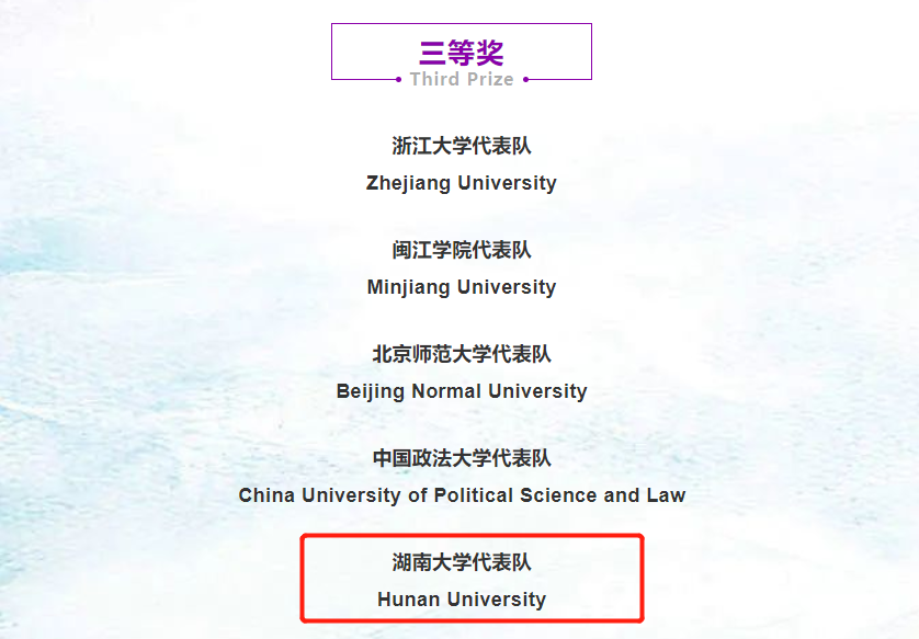 代表队以卓越的表现荣获Best Memo(最佳文书奖,全国第一)以及Third Class Prize(三等奖)。与此同时,岳正圆同学荣获Best Oralist(最佳辩手);曲筝同学荣获Outstanding Contribution Award(团队突出贡献奖)。本次获奖是我院学科竞赛和本科生人才培养的又一可喜成果。