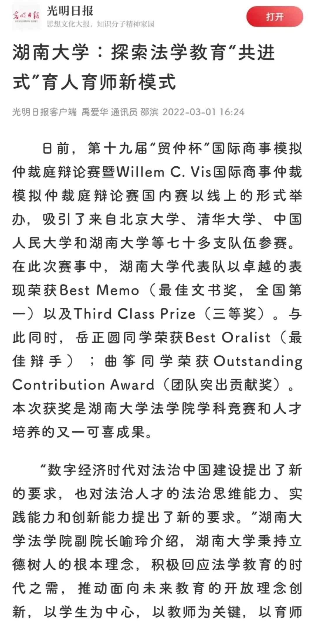 蝉联“淮海•玉龙杯”全国高校模拟法庭大赛法官组冠军,在十九届“贸仲杯”国际商事仲裁模拟仲裁庭辩论赛中,我院代表队荣获最佳文书奖(全国第一)和全国三等奖。