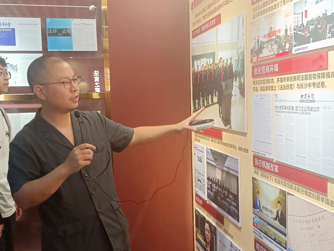 随后,在望城区人民法院综合办公室副主任龙峰的带领下,同学们前往院史荣誉室、“法官之家”进行参观。通过院史荣誉室所陈列的图片和文字介绍,同学们进一步了解到望城区人民法院的发展历程,体悟到不同的地域文化。“法官之家”向同学们展现出法院工作人员生活和工作情景,增强同学们对司法工作的兴趣,拉近法官与同学们之间的距离。
