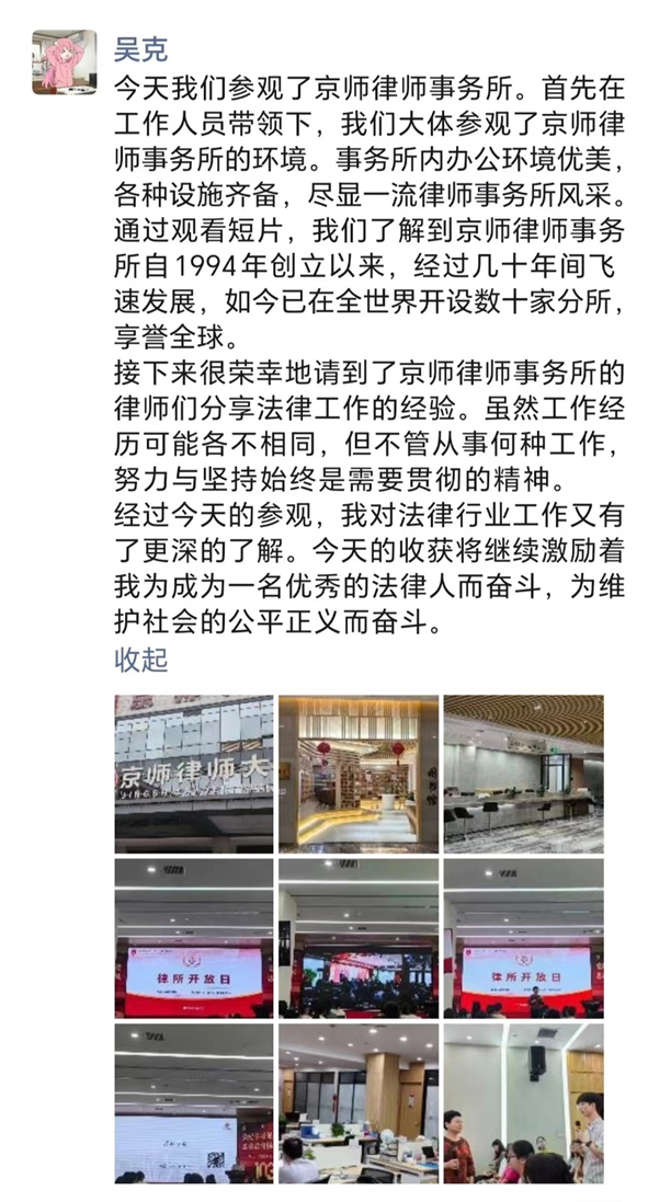 2023级的同学们,他们对法学相关知识已经有了基本的认识,但对于未来就业方向和奋斗目标仍存在许多困惑,本次律所参访活动恰逢其时。参访活动不但为同学们提供了就业方面的指导,也为同学们未来努力的方向提供指引,让同学们更加坚定了对法学学习的热爱和敬畏之心。很多同学深有感触,纷纷在朋友圈分享自己的心得体会。