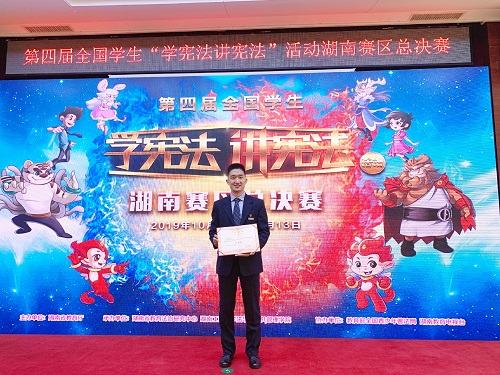 10月12日,第四届全国学生“学宪法讲宪法”活动湖南赛区总决赛在长沙举行。全省14个地州市的中小学及10所高校的百余名选手分小学组、初中组、高中组和大学组参加法治知识竞赛和演讲比赛,我院2016级本科生陈劲宏经过严格选拔,参加了大学组演讲比赛的总决赛。
