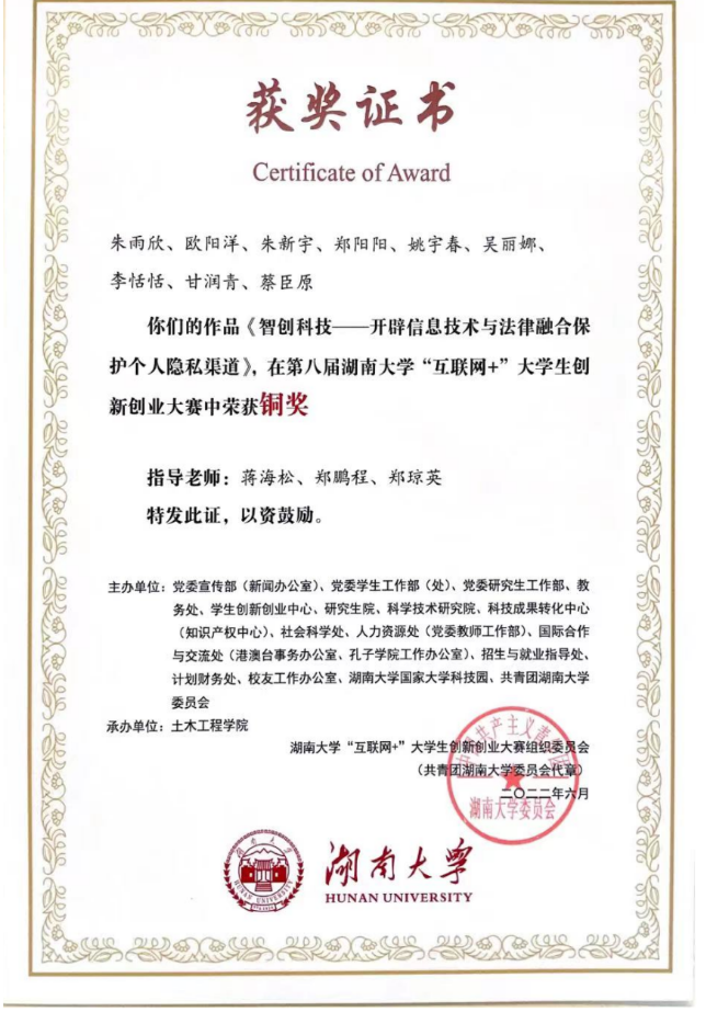 1905班朱雨欣同学主持申报,蒋海松、郑鹏程、郑琼英老师指导的项目“智创科技——开辟信息技术与法律融合保护个人隐私渠道”获得铜奖。本次获奖展示了我院学子的学术创新创业能力,反映了我院在本科生人才培养方面的进步,是我院提升本科生人才培养质量、坚持开展学术创新训练与创业教育的成果。