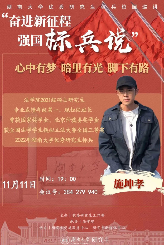 优秀研究生标兵、国家奖学金获得者施坤孝作为主讲人,以“心中有梦,暗里有光,脚下有路”为主题,向全体研究生分享学习、科研、就业、未来规划等方面的个人经验,为我院同学的研究生生涯提供帮助。