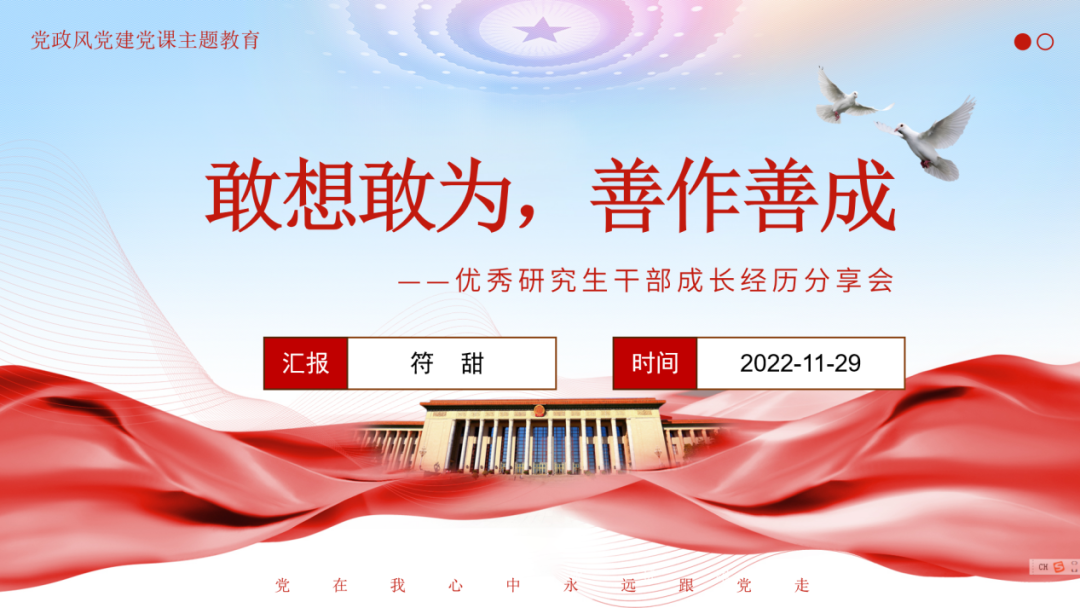 会议伊始,符甜同学结合邓卫书记对党的二十大精神宣讲,分别从党的二十大主要成果、新时代10年的伟大变革及其里程碑意义、面临的国内风险挑战、如何践行党的二十大精神四个方面详细介绍了自己对党的二十大精神的所想所感。