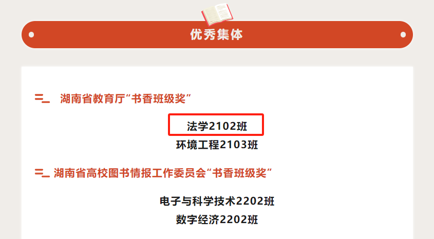 2024年2月,湖南省教育厅公布了《关于2023年全省普通本科高校“一校一书”阅读推广活动评选结果的通报》(湘教通〔2023〕378号),我院法学2102班在评选过程中,荣获湖南省教育厅“书香班级奖”。让我们一起看看“书香班级”的风采吧!