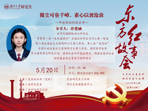 “东方红故事会”里的每段讲述都是青春最鲜活的注脚,那些在科研路上勇攀高峰的坚守、在实践途中知行合一的探索、在服务社会时初心如磐的担当,早已超越个体经历的范畴,化作照亮研途的精神火炬。愿这份从讲台传递出的滚烫力量,能让更多研究生在逐梦路上以榜样为帆、以奋斗为桨,在湖大这片沃土上续写属于新时代青年的成长史诗,让青春在与祖国同频共振的征程中绽放更璀璨的光芒。