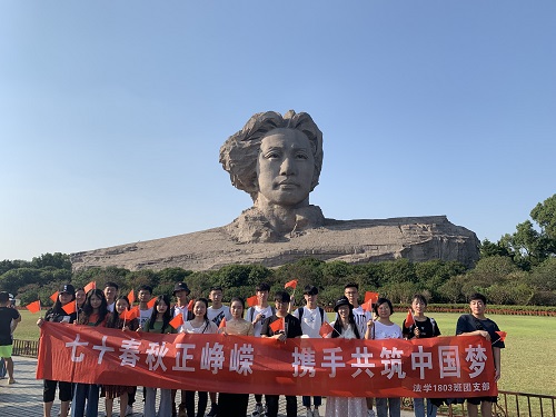 为激励和引导班级同学以积极向上的精神风貌庆祝中华人民共和国成立七十周年,保持不断进取的奋斗精神,激发爱国热情,9月28日,法学1803班组织班级同学前往橘子洲头,举办“七十春秋正峥嵘,携手共筑中国梦”主题团日活动。