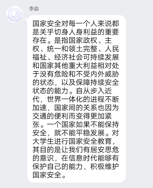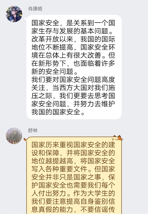 同学们集体线上观看国家安全直播课,对国家安全相关知识有了更加深入的了解。在观看直播课后,同学们在qq群中分享自己关于国家安全内容和重要性的理解,并根据当前国情和社会发展现状进行分析,阐述新时代增强国家安全意识和加强法治建设的必要性。随后,同学们结合此次新型冠状病毒疫情的情况,进一步举例阐述国家安全意识的重要性,同时根据个人的实际经历提出大学生在面临安全威胁时的处理方法和相关建议。