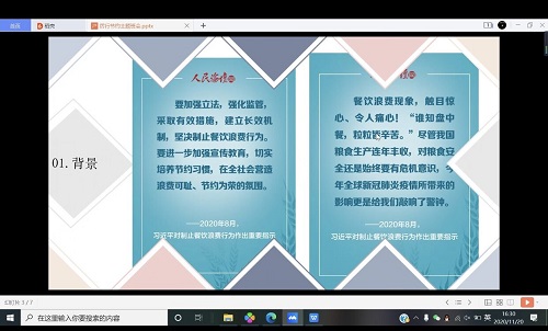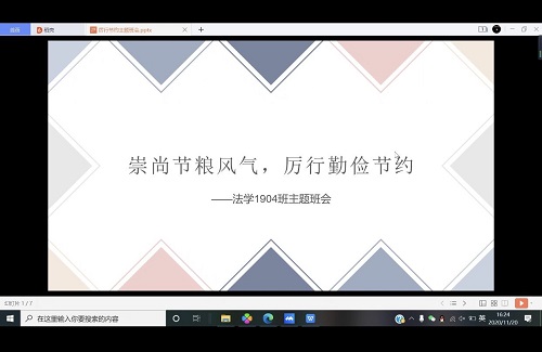 为深入学习贯彻习近平总书记重要讲话和中央关于厉行节约、反对浪费的重要指示精神,落实教育部研究制定的《教育系统“制止餐饮浪费 培养节约习惯”行动方案》,引导大学生树立勤俭节约的意识,养成勤俭节约良好习惯,2020年11月20日下午,法学1904班团支部采取腾讯会议的方式召开“崇尚节粮风气,厉行勤俭节约”主题班会。本次班会由班长主持。
