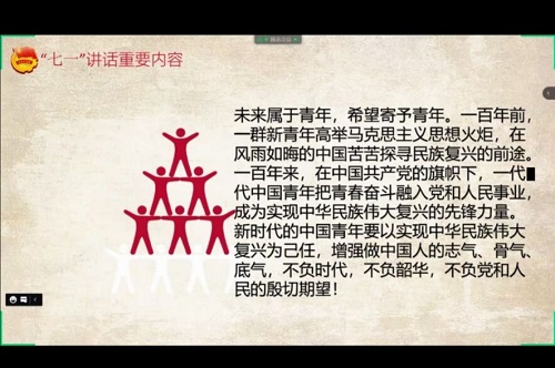 在下一步会议中,李丹阳同学组织同学们对“七一”重要讲话内容与精神进行了相关学习,在本次学习中,同学们深情回顾中国共产党一百年奋斗历史,展望中华民族伟大复兴的光明前景,思考着在新的征程中青年学生将如何堪当民族复兴大任的历史命题。习近平总书记在庆祝中国共产党成立100周年大会讲话中强调:“未来属于青年,希望寄予青年。新时代的中国青年要以实现中华民族伟大复兴为己任,增强做中国人的志气、骨气、底气,不负时代,不负韶华,不负党和人民的殷切期望”更是让同学们得到深受震撼,在新中国百年历程中,青年一直是国家发展的主力军,作为当代大学生的我们,应当敢于承担时代重任,为实现中华民族伟大复兴不懈奋斗,不负青春,不负韶华。