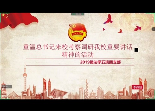 为确保把习近平总书记重要讲话精神转化为中国特色世界一流大学建设的有力行动,深入学习习近平总书记“七一”重要讲话精神。2021年9月14日,在团支书李丹阳同学的主持下,法学1905班顺利召开了“重温总书记考察调研我校重要讲话精神”线上主题团日活动。