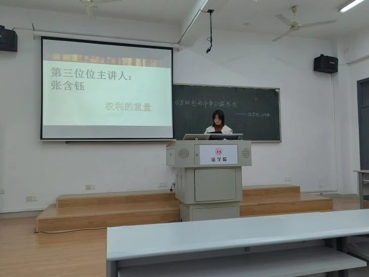 邓敏佳同学首先发言,她围绕“法治中国建设背景下的‘为权利而斗争’”这一主题,从为权利而斗争对国家而言的重要性、中国的法治化颇有成就也前路漫漫、国家和个人都应崇尚“为权利而斗争”的精神并付诸实践这三个方面进行分享。