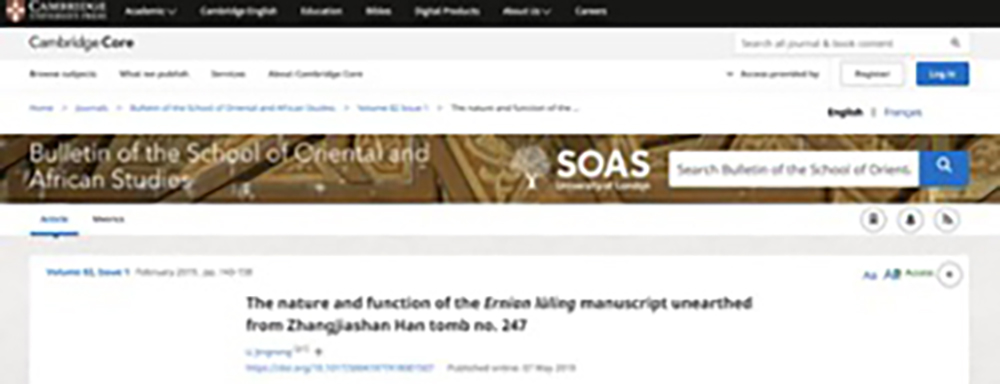 近日,我院李婧嵘助理教授,以独立作者所著论文《The Nature and Function of the Ernian lüling Manuscript Unearthed from Zhangjiashan Han Tomb No. 247》被创刊于1917年的国际顶级综合性期刊《Bulletin of the School of Oriental and African Studies》录用发表。