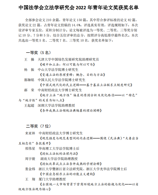 我院助理教授周宇骏老师的论文《授权改革试点立法条件成熟的学理诠释》在本次研究会中荣获青年论文二等奖。其围绕着《立法法》第13条所规定的授权改革制度的优化进行了专题汇报,阐述授权改革试点立法条件成熟的判断标准,为《立法法》的合理修改与试点法治的实践优化提出智力支持。