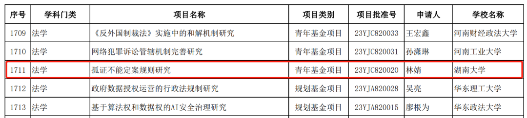 2023年10月18日,教育部社会科学司公布了2023年度教育部人文社会科学研究一般项目立项的通知,我院助理教授林婧所申报的法学研究青年项目《孤证不能定案规则研究》获得立项,项目批准号为23YJC820020。