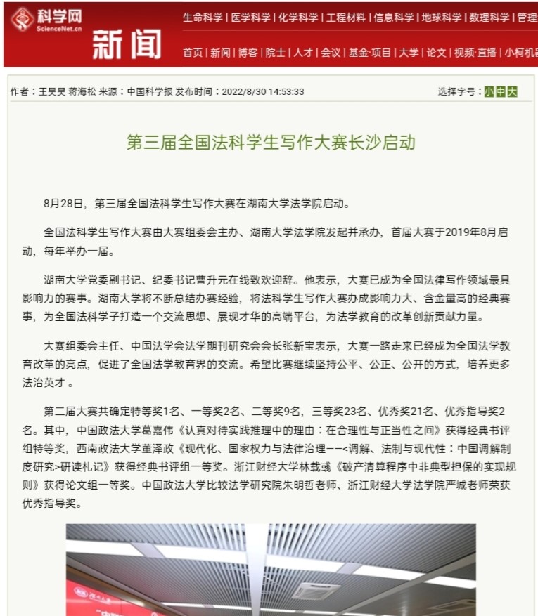 第二届大赛特等奖1名、一等奖2名、二等奖9名,三等奖23名、优秀奖21名、优秀指导奖2名。其中,中国政法大学葛嘉伟《认真对待实践推理中的理由:在合理性与正当性之间》获得经典书评组特等奖,西南政法大学董泽政《现代化、国家权力与法律治理——<调解、法制与现代性:中国调解制度研究>研读札记》获得经典书评组一等奖。浙江财经大学林载彧《破产清算程序中非典型担保的实现规则》获得论文组一等奖。中国政法大学比较法学研究院朱明哲老师、浙江财经大学国产av