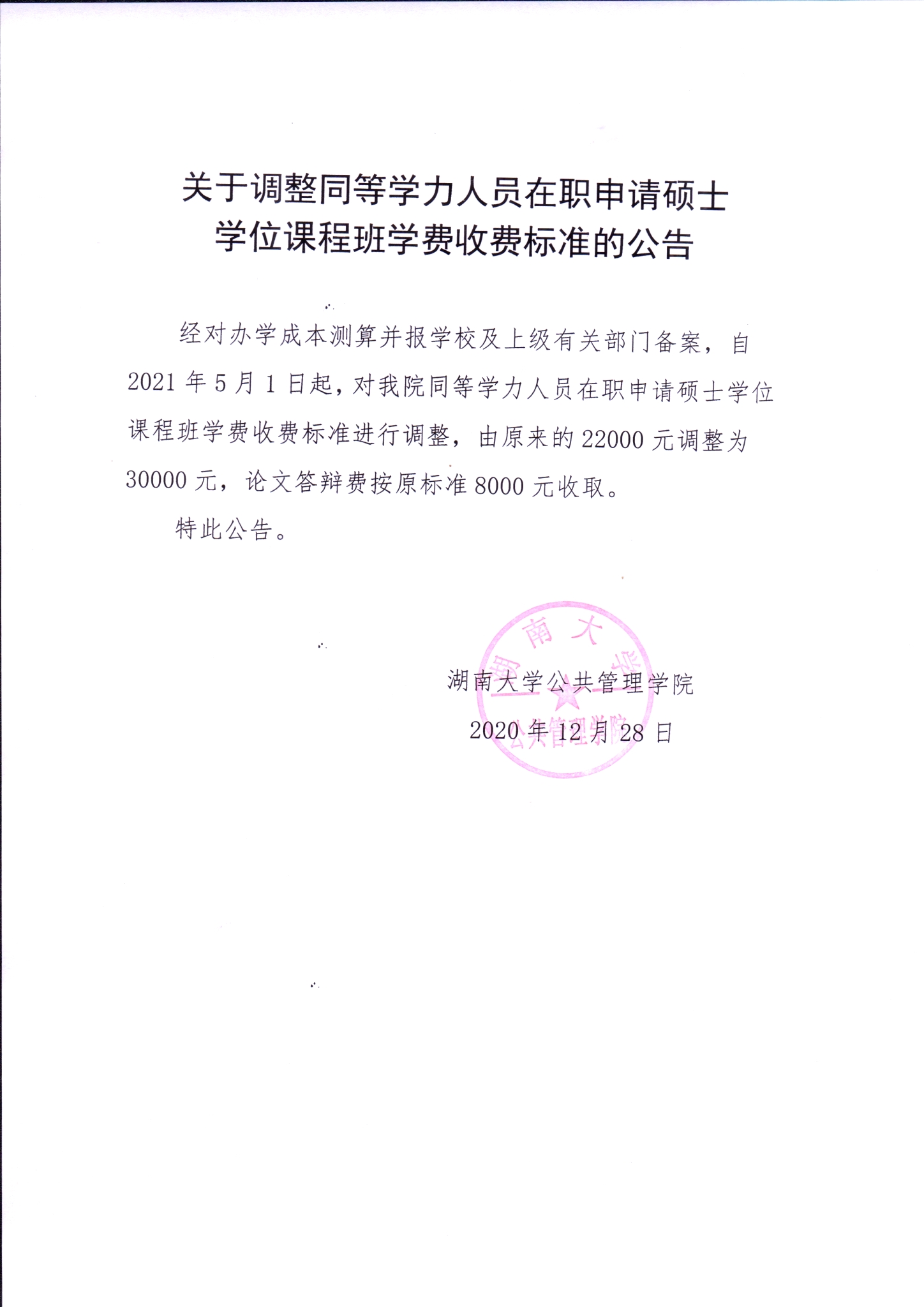 关于调整同等学力人员在职申请硕士学位课程班学费收费标准的公告