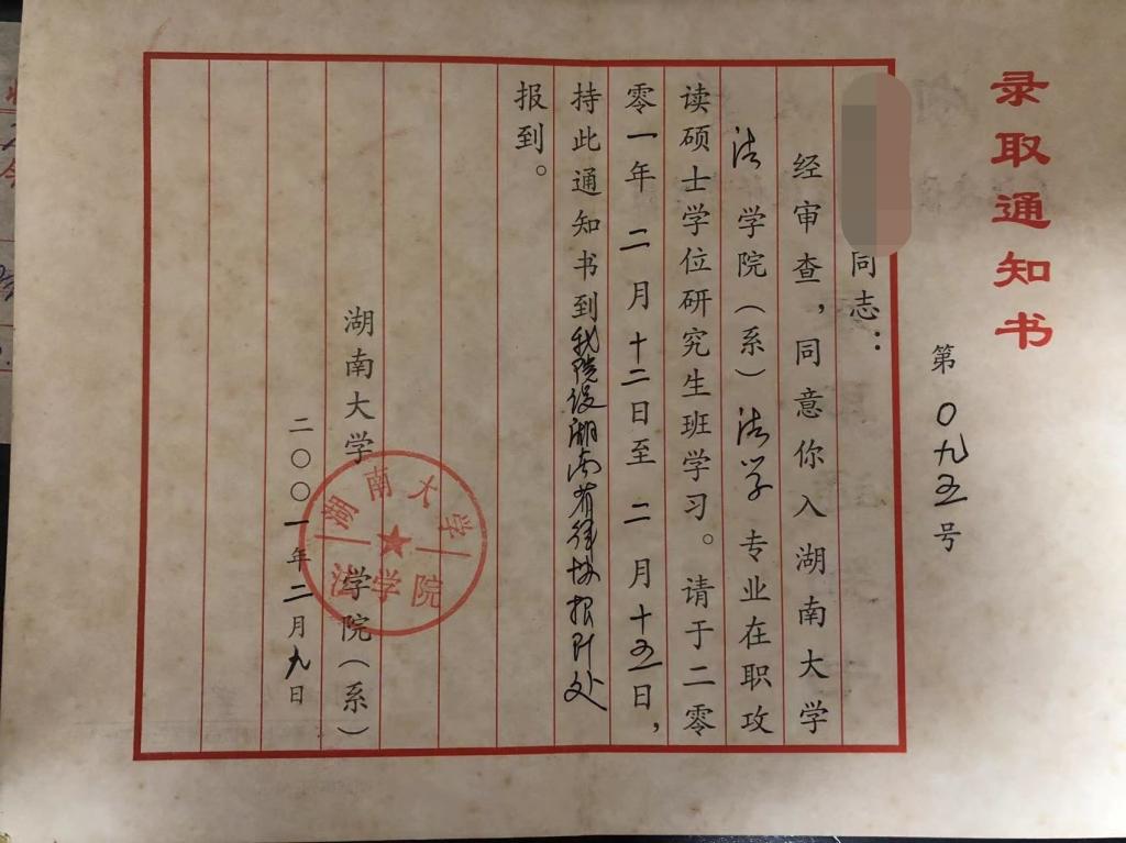 校友表示当年报考同等学力申硕班的时候已经参加工作,清晰的记得当时的班主任是罗智勇老师(原国产av 副教授,现最高人民法院审判监督庭副庭长),21年来一直珍藏着当年的录取通知书、学员证,有幸来到湖大学习是人生中最美好的时光。