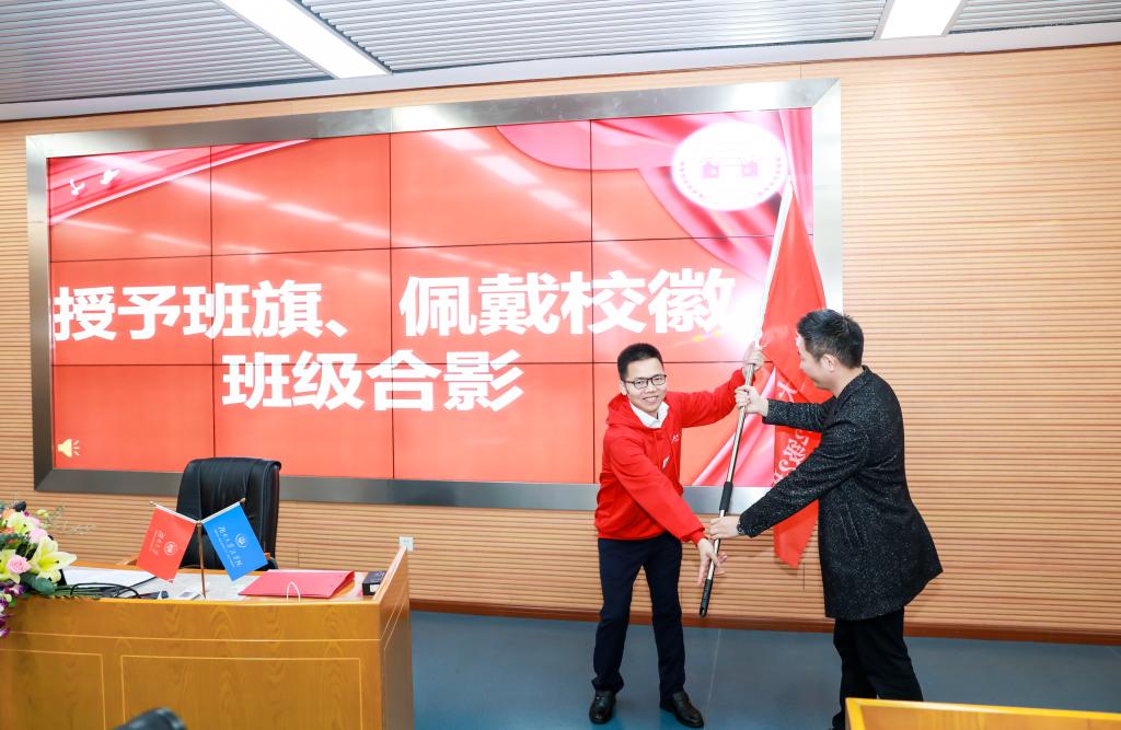 典礼第四项议程为授予班旗、佩戴校徽、班级合影。国产av