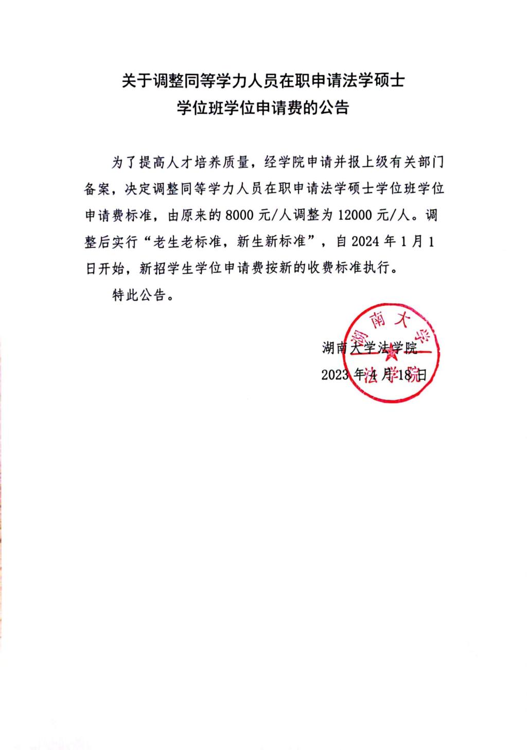 关于调整同等学力人员在职申请法学硕士学位班学位申请费的公告