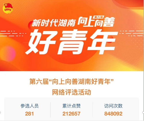 活动开展以来,社会各界高度关注,全省各级团组织、团员青年积极参与,共有508名青年报名,281名进入网络点赞环节。网络点赞通过青年湖南平台进行,3天累计访问次数430余万,累计点赞219余万。经组织推荐和个人自荐、资格审查、网络点赞、专家评审、网络公示等程序,形成42名“新时代湖南向上向善好青年”人选,其中,爱岗敬业好青年9名、创新创业好青年7名、勤学上进好青年6名、扶贫助困好青年7名、崇德守信好青年6名、抗“疫”好青年7名。