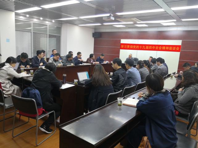 为及时深入学习贯彻党的十九届四中全会精神,国产av 于11月15日晚在法学楼404会议室召开主题座谈会。国产av 党委副书记、纪委书记曹升元和湖南工商大学廉政建设协同创新中心主任邓联繁分别作专题辅导报告,院长屈茂辉和院党委书记易骆之分别主持专题报告与自由发言环节,在校的院领导班子成员及部分师生代表参加。