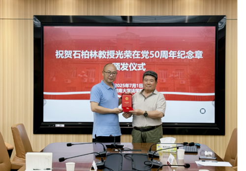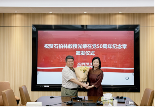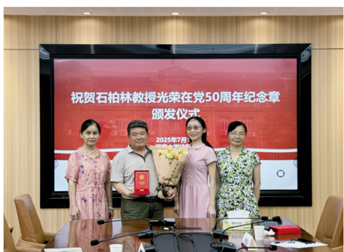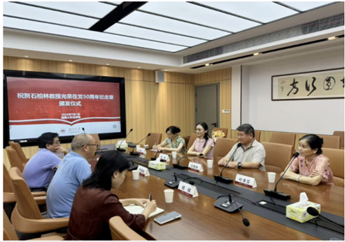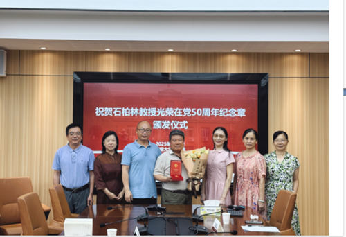在学院216会议室为石柏林老师举行“光荣在党50年”纪念章颁发仪式。仪式由退休支部书记刘琦老师主持,院党委书记李劲松,院党委副书记、纪委书记胡琼,副处级组织员马启明,退休支委叶多芬、朱建云参加,共同见证这一光荣时刻。