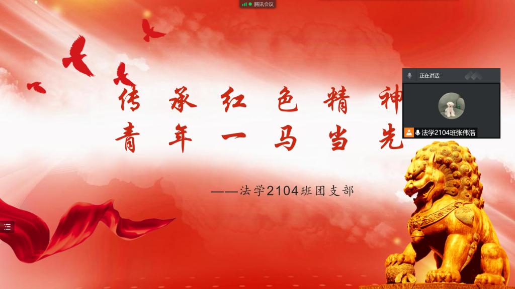 法学2104班团支部于2022年4月29日召开“传承红色精神,青年一马当先”团日活动。本次团日活动采取线上腾讯会议的方式,由张伟浩同学主持,法学2104班全体同学参加。