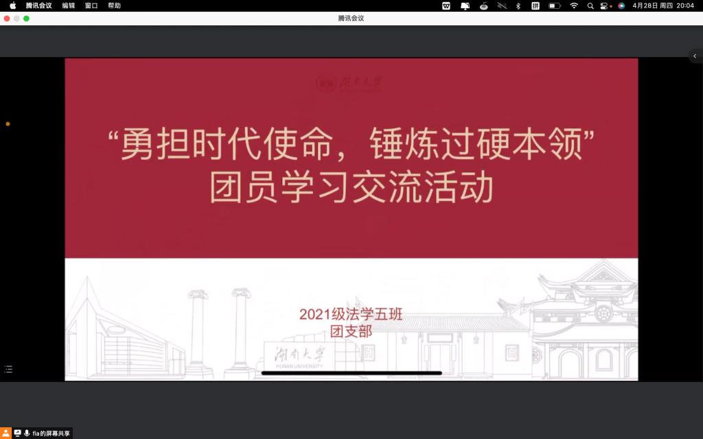 法学2105班于2022年4月28日晚上在腾讯会议平台上开展了以“勇担时代使命,锤炼过硬本领”为主题的线上团员学习交流活动。本次活动由团支书靳高策主持,全体团员参会。