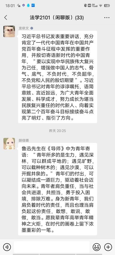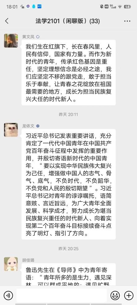 在团支书的组织下,团员们就自己的感悟进行了踊跃的发言。张楚瑜同学表示:“习近平总书记指出,加快构建中国特色哲学社会科学,归根结底是建构中国自主的知识体系,法学作为社会科学中的一门重要学科,在新时代中国建设中发挥着重要的作用,作为法学生,我们要自觉承担好学术己任,做好时代大潮中的一滴水。”曹永柯同学表示:“在共青团成立成立100周年的历史时刻,习近平总书记的讲话对我们是一次重要的思想洗礼,在严峻复杂的国际形势之下,我们要坚定党的领导,作为新时代青年,我们要严以律己,为中国特色社会主义添砖加瓦。”