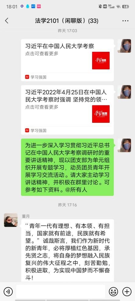 中国共青团建团100周年、五四青年节前夕,习近平总书记到中国人民大学考察,并深情寄语广大青年,引起全国高校师生热烈反响。为了进一步深入学习贯彻习近平总书记在考察调研时的重要讲话精神,法学本科2021级各团支部组织开展了“学习习近平总书记在中国人民大学考察调研时的重要讲话精神”主题团日活动。